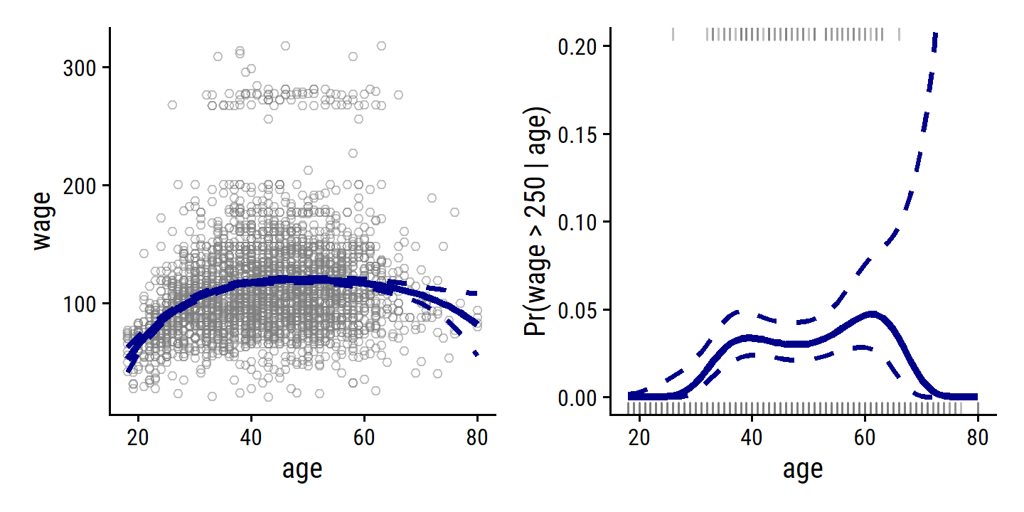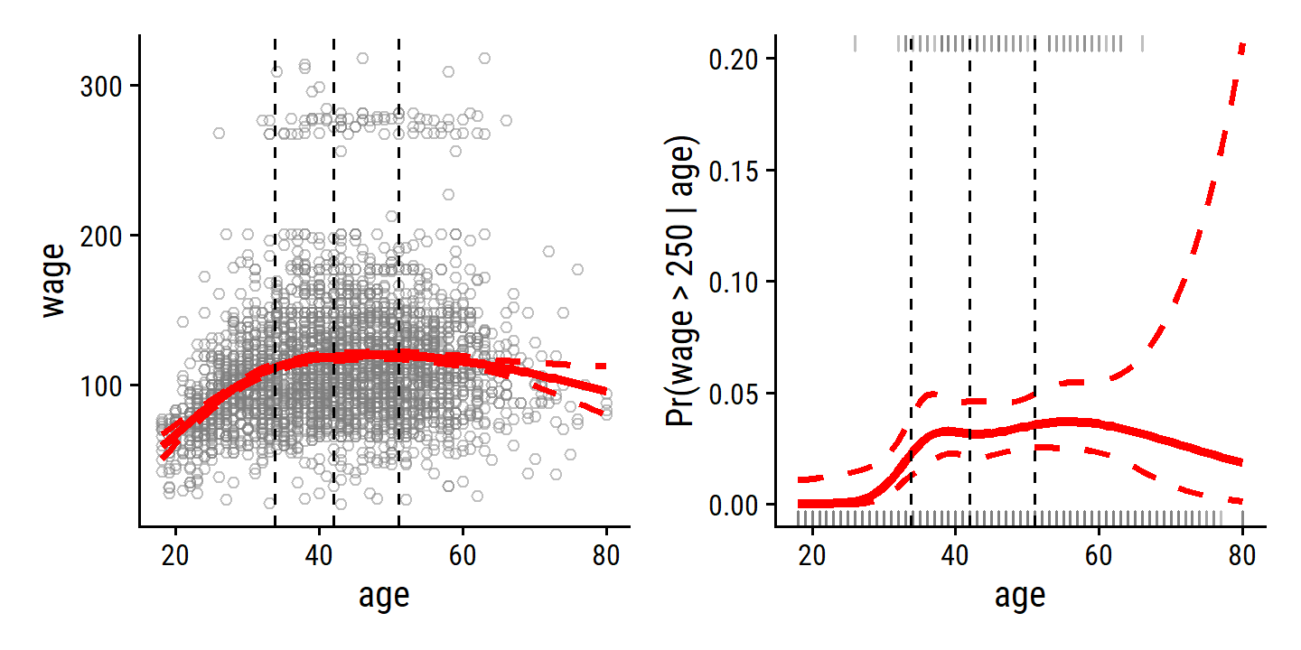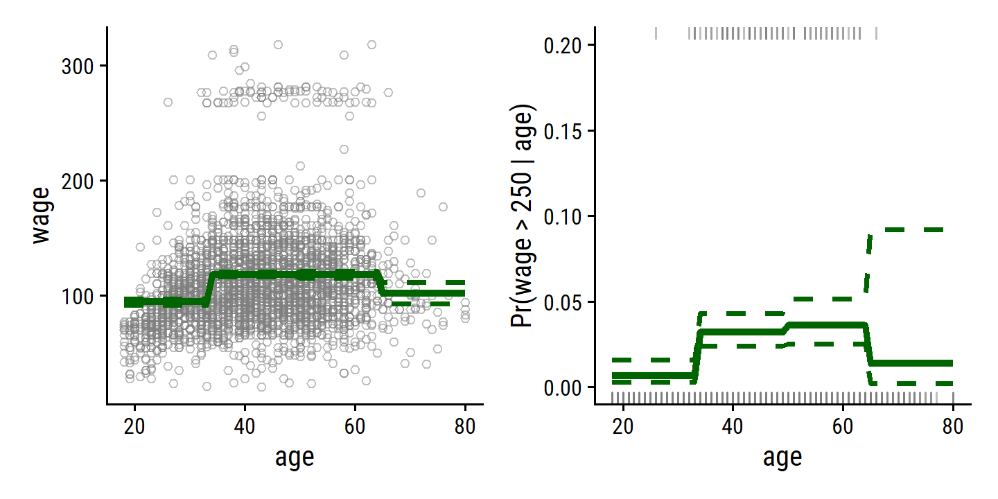 Unfortunately, unless there are natural breakpoints in the predictors, piecewise-constant functions can miss the action. For example, in the left- hand panel of Figure 7.2, the first bin clearly misses the increasing trend of wage with age. Nevertheless, step function approaches are very popular in biostatistics and epidemiology, among other disciplines. For example, 5-year age groups are often used to define the bins.