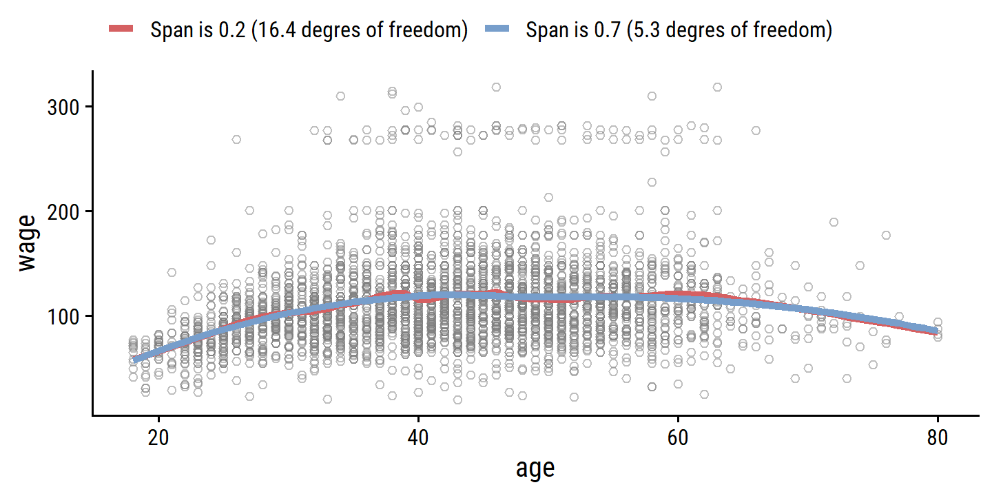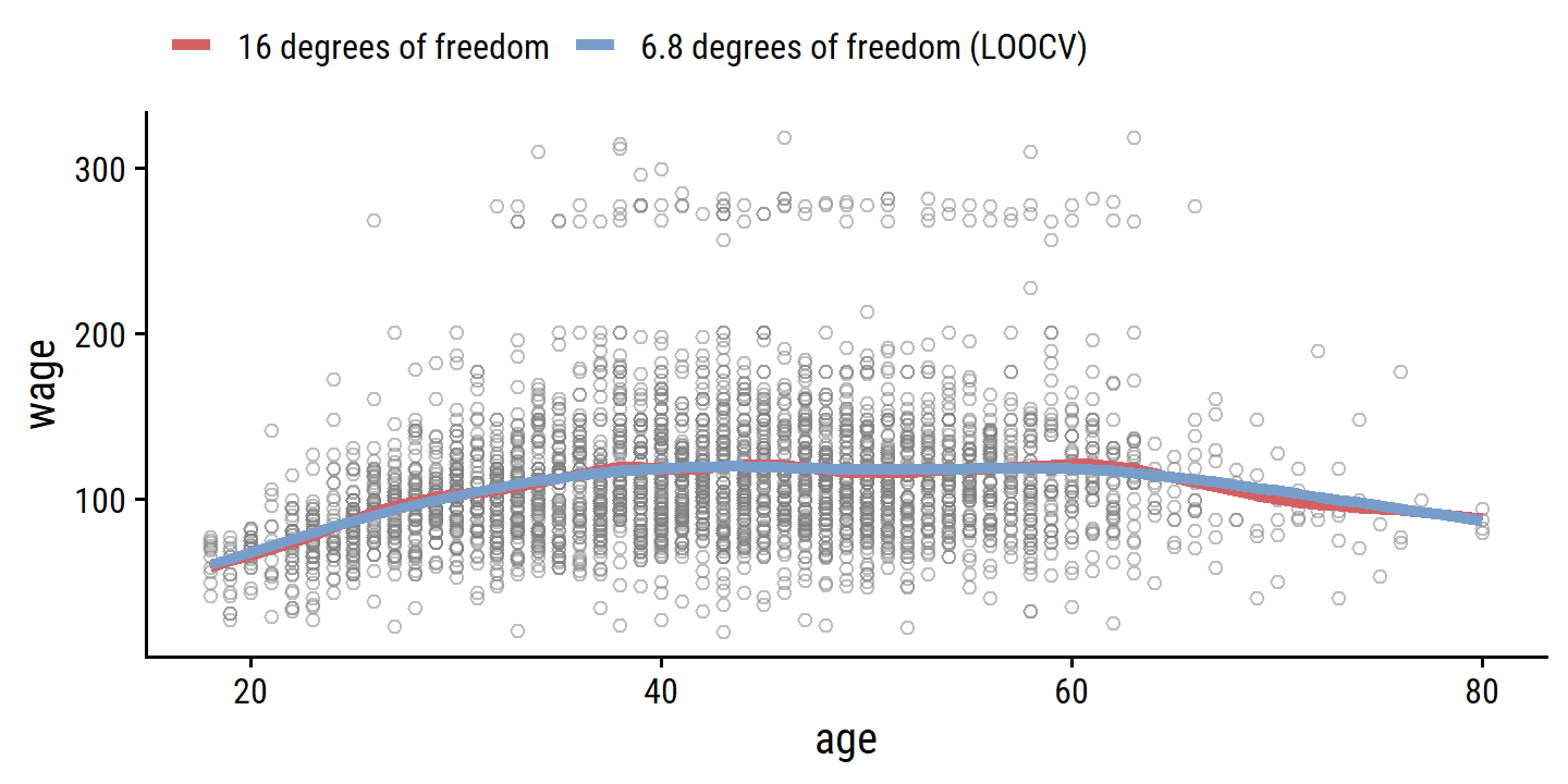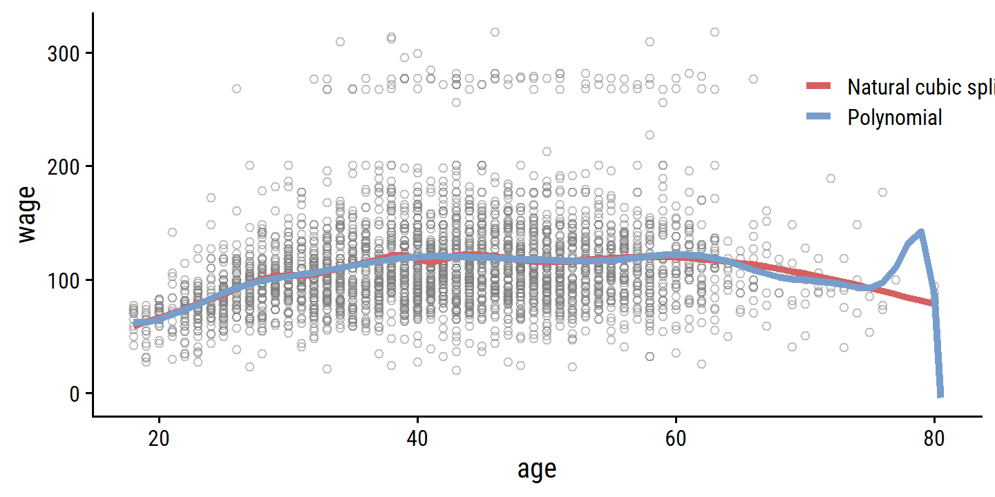 The problem with piecewise polynomials is that the resulting fit can be discontinuous, like in the top left panel of Figure 7.3. To remedy this, we can fit a piecewise polynomial under the constraint that the fitted curve must be continuous, like in the top right panel. The bottom left panel shows the result of two additional constraints: that the first and second derivative are continuous at age = 50 – this is called a cubic spline, which generally has \(K + 4\) degrees of freedom (=5 in this example). The lower right panel shows a linear spline.