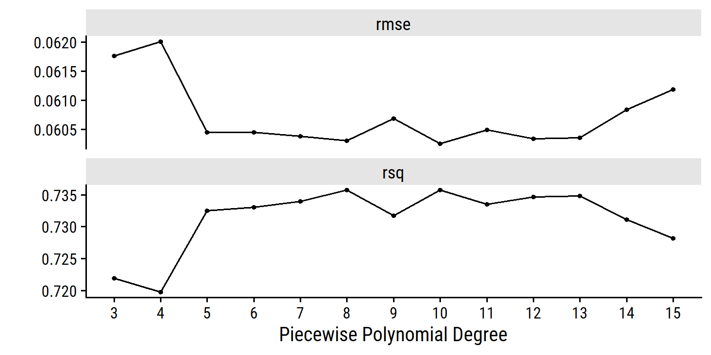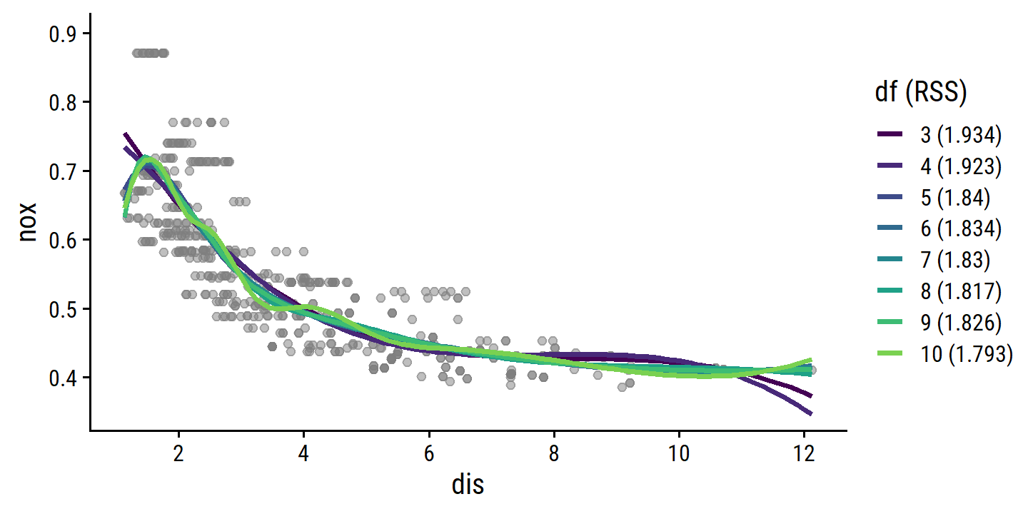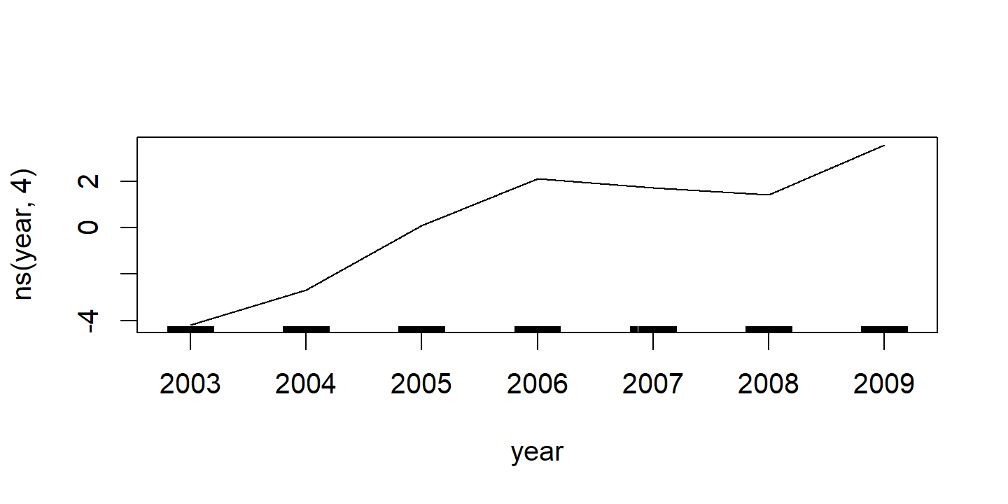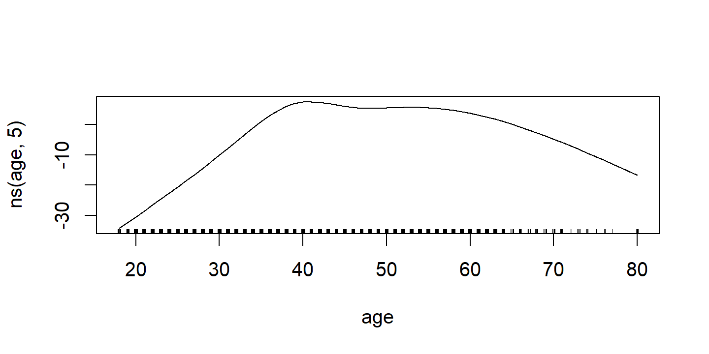 where \(\xi\) is the knot. One can show that adding the term \(\beta_4 h(x, \xi)\) to the cubic spline model above will lead to a discontinuity in only the third derivative at \(\xi\), but remain continuous in the first and second derivatives.