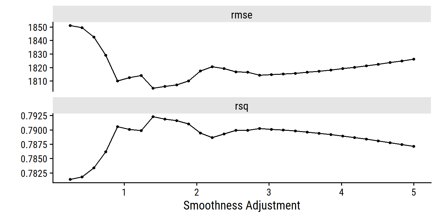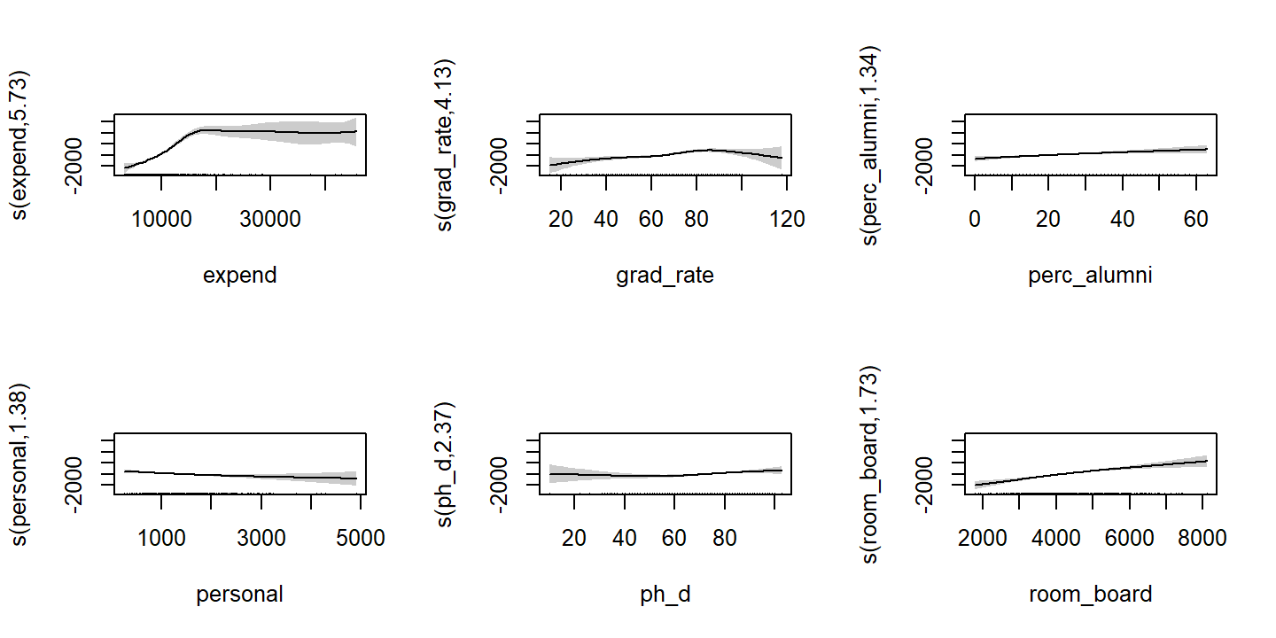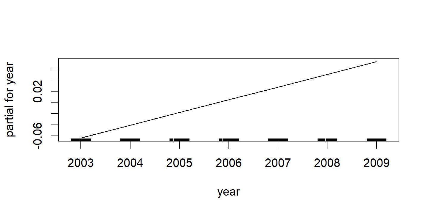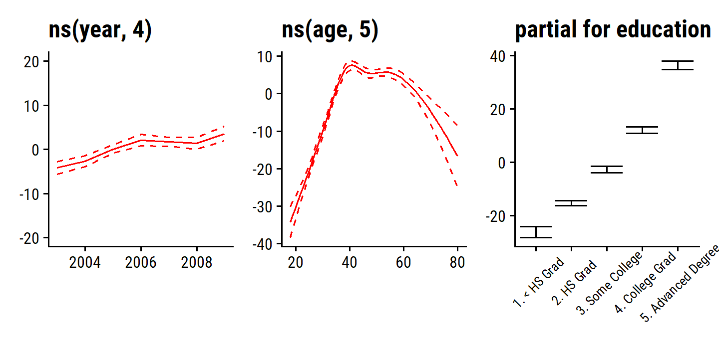 where \(\xi\) is the knot. One can show that adding the term \(\beta_4 h(x, \xi)\) to the cubic spline model above will lead to a discontinuity in only the third derivative at \(\xi\), but remain continuous in the first and second derivatives.