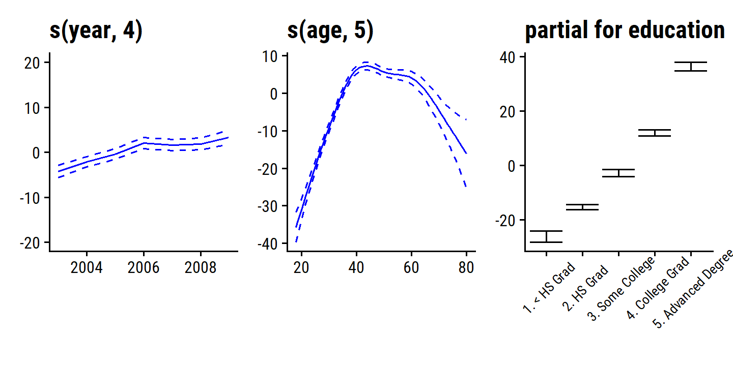 Functionally, this is essentially fitting two separate regression equations on subsets of \(X\), with 8 degrees of freedom for the eight regression coefficients.