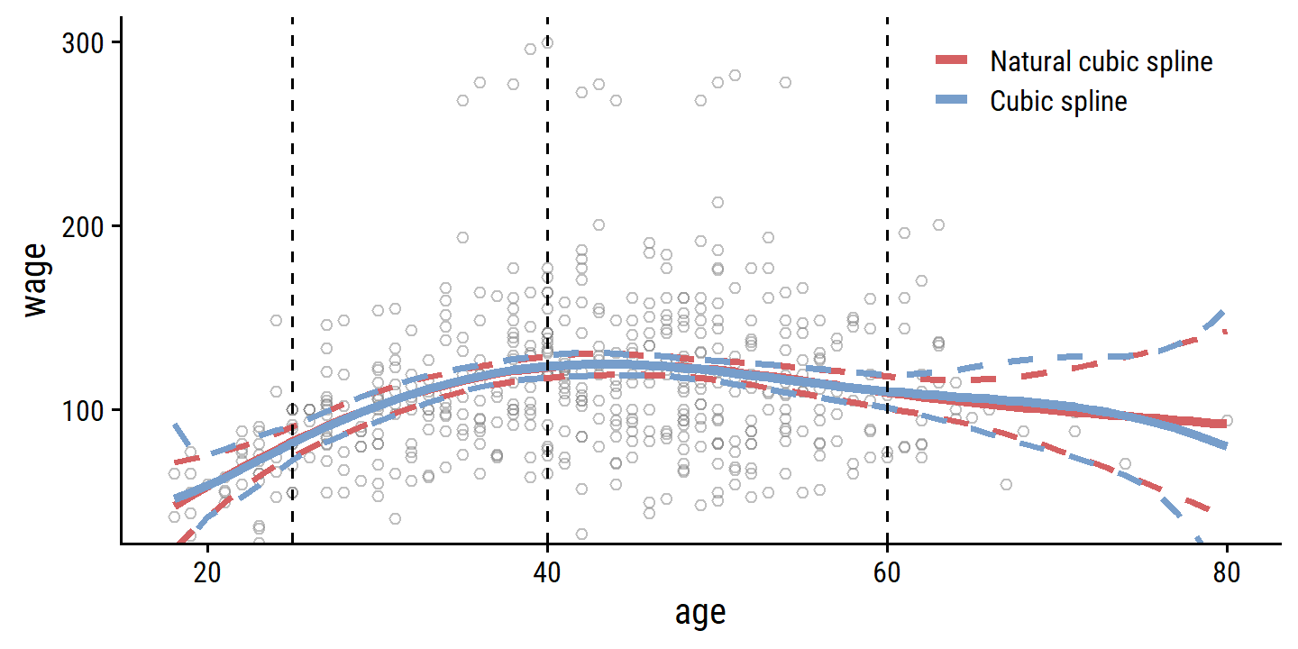 Unfortunately, these splines have high variance at boundaries of the predictors. This can be reduced with natural splines which have additional constraints at the boundaries to produce more stable estimates. We can show this with confidence intervals of the models fit with cubic and natural cubic splines, as in Figure 7.4: