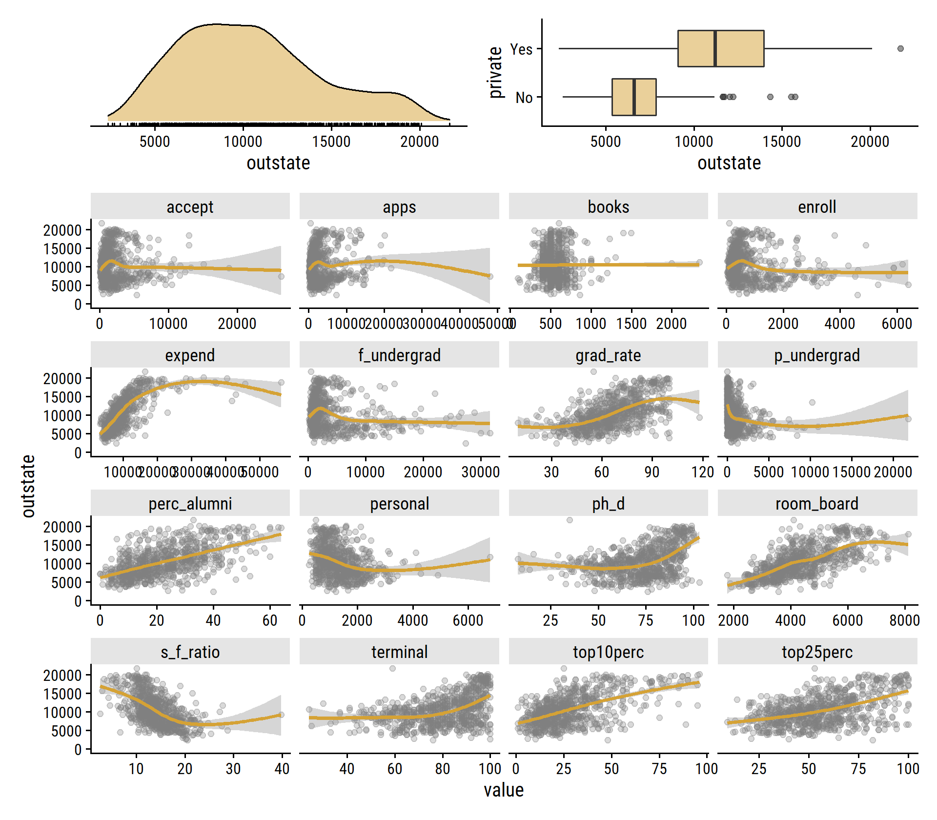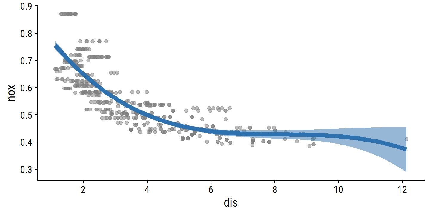 In polynomial regression, these basis functions were \(b_j(x_i) = x_i^j\). In piecewise-constant regression, they were \(b_j(x_i) = I(c_j \leq x_i < c_{j+1})\). Despite the increased complexity, this still amounts to estimating the unknown regression coefficients \(\beta\), for which all the least squares tools and models apply.