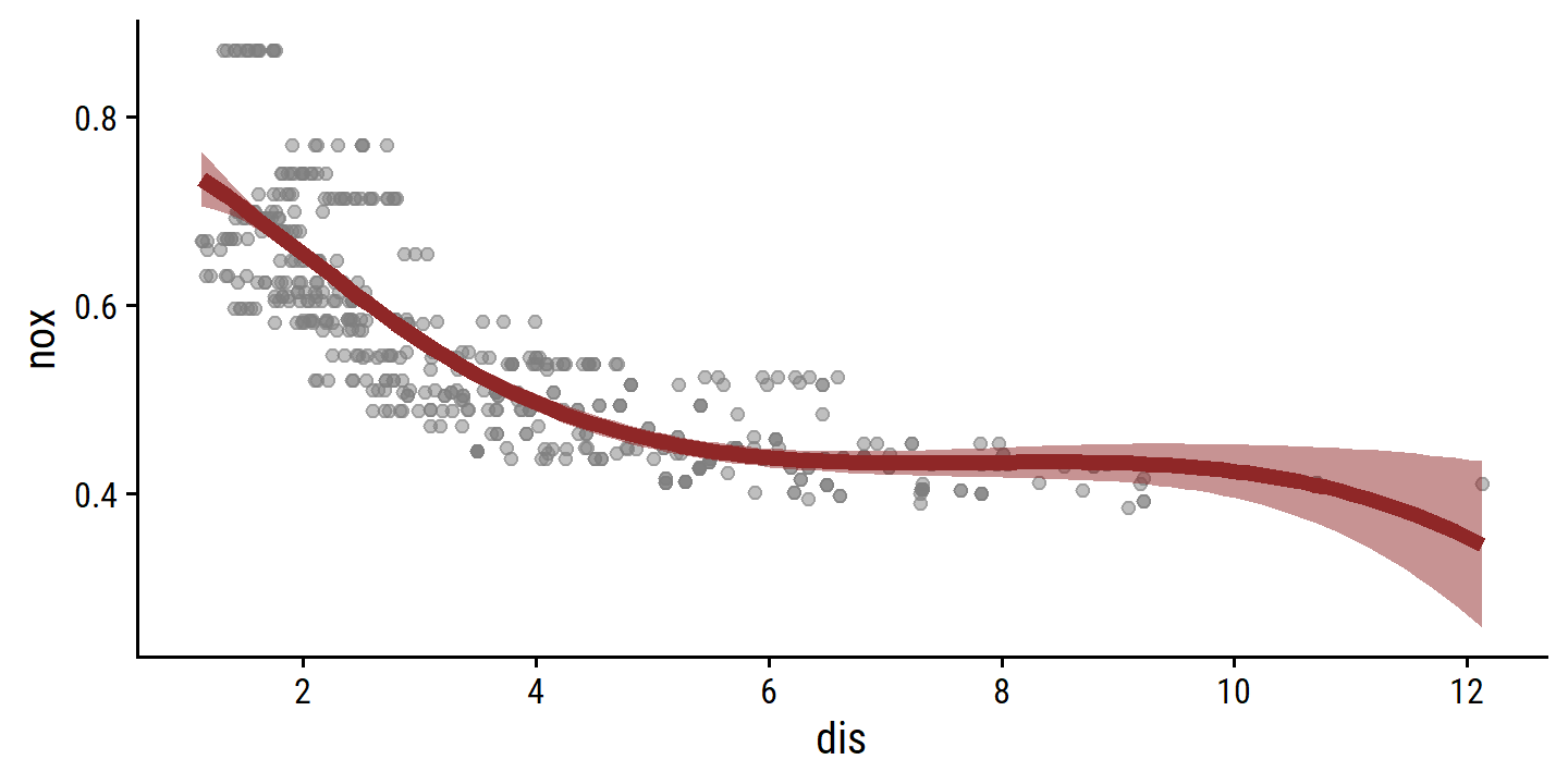 • Regression splines are a flexible combination of polynomials and step functions that involve polynomial functions fit to data in \(K\) distinct regions.